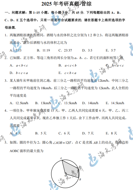 2025全国研究生初试已经全部结束,2025管理类综合能力大家考的怎么样呢?知道大家都在关注2025考研真题及答案解析,海天考研网为各位考生带来2025管综199考研真题完整版,包括管综199问题求解、条件充分性判断、逻辑推理、论证有效性分析和论说文写作,助力各位学子考研初试后核对答案提前估分,2026考研生也可以提前了解一下。